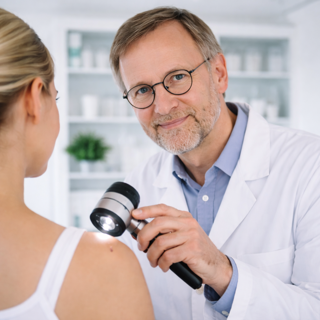 Beim Hautcheck beurteilen wir Ihre Haut systematisch – inklusive auffälliger Muttermale oder Veränderungen. Bei Bedarf nutzen wir eine Auflichtmikroskopie (Dermatoskopie) und dokumentieren auffällige Stellen zur Verlaufskontrolle.